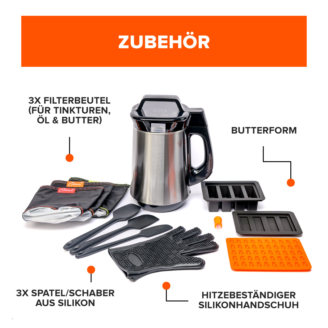 | Zubehör: | BPA FREIE Teile. Juice cup (600ml), pulp cup (600ml), pusher (tamper), juicer auger, fine filter (strainer), blank plate (for making sorbet), cleaning brush, juicer recipe book, instruction manual |